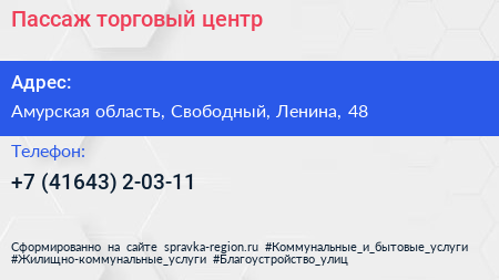 Пассаж, торговый центр по адресу Амурская область, Свободный, Ленина, 48 в дальнейшем Организация, размещена в следующих категориях: