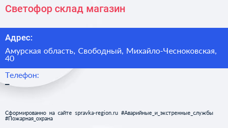 Светофор, склад-магазин по адресу Амурская область, Свободный, Михайло-Чесноковская, 40 в дальнейшем Организация, размещена в следующих категориях: