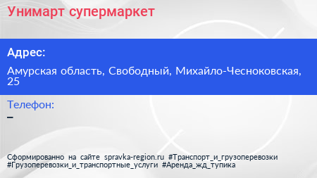 Унимарт, супермаркет по адресу Амурская область, Свободный, Михайло-Чесноковская, 25 в дальнейшем Организация, размещена в следующих категориях:
