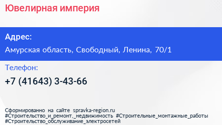 Ювелирная империя по адресу Амурская область, Свободный, Ленина, 70/1 в дальнейшем Организация, размещена в следующих категориях: