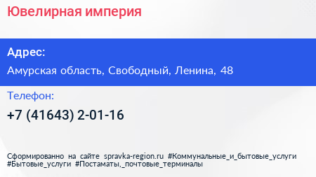 Ювелирная империя по адресу Амурская область, Свободный, Ленина, 48 в дальнейшем Организация, размещена в следующих категориях: