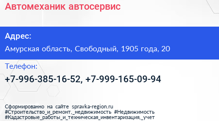 Автомеханик, автосервис по адресу Амурская область, Свободный, 1905 года, 20 в дальнейшем Организация, размещена в следующих категориях: