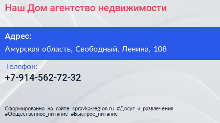 Наш Дом, агентство недвижимости по адресу Амурская область, Свободный, Ленина, 108 в дальнейшем Организация, размещена в следующих категориях: