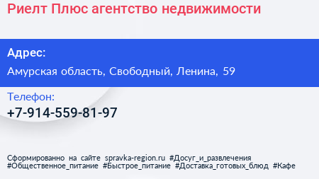 Риелт Плюс, агентство недвижимости по адресу Амурская область, Свободный, Ленина, 59 в дальнейшем Организация, размещена в следующих категориях: