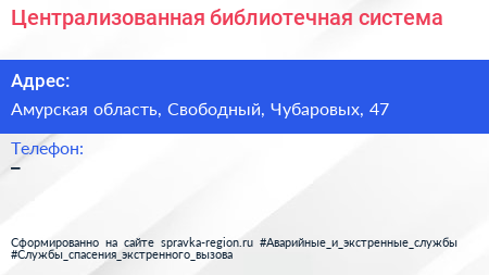 Централизованная библиотечная система по адресу Амурская область, Свободный, Чубаровых, 47 в дальнейшем Организация, размещена в следующих категориях: