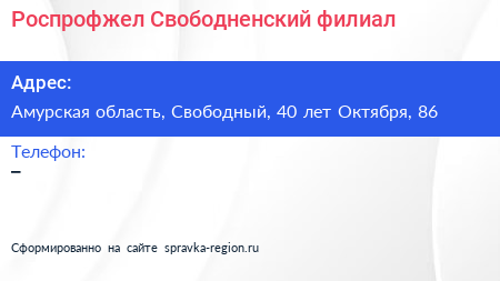 Роспрофжел, Свободненский филиал по адресу Амурская область, Свободный, 40 лет Октября, 86 в дальнейшем Организация, размещена в следующих категориях: