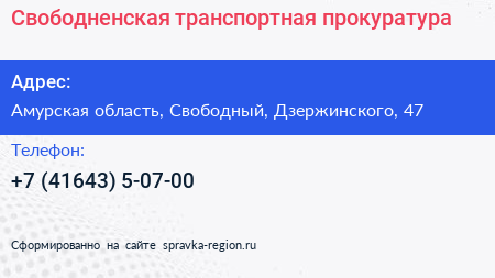 Свободненская транспортная прокуратура по адресу Амурская область, Свободный, Дзержинского, 47 в дальнейшем Организация, размещена в следующих категориях:
