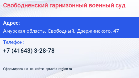 Свободненский гарнизонный военный суд по адресу Амурская область, Свободный, Дзержинского, 47 в дальнейшем Организация, размещена в следующих категориях: