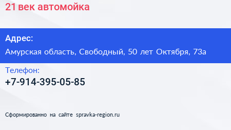21 век, автомойка по адресу Амурская область, Свободный, 50 лет Октября, 73а в дальнейшем Организация, размещена в следующих категориях: