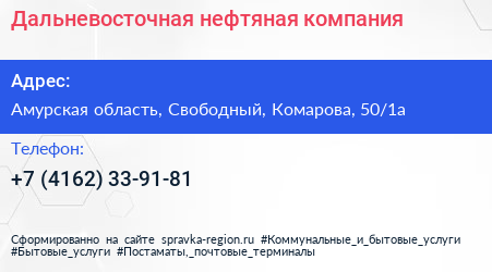 Дальневосточная нефтяная компания по адресу Амурская область, Свободный, Комарова, 50/1а в дальнейшем Организация, размещена в следующих категориях: