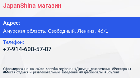 JapanShina, магазин по адресу Амурская область, Свободный, Ленина, 46/1 в дальнейшем Организация, размещена в следующих категориях: