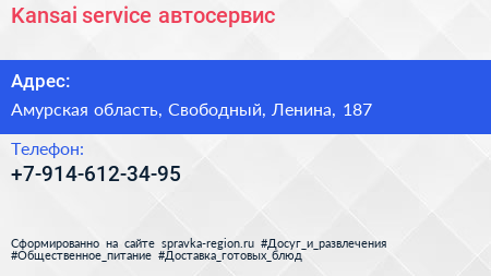 Kansai service, автосервис по адресу Амурская область, Свободный, Ленина, 187 в дальнейшем Организация, размещена в следующих категориях: