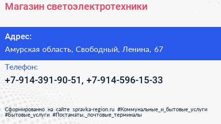 Магазин светоэлектротехники по адресу Амурская область, Свободный, Ленина, 67 в дальнейшем Организация, размещена в следующих категориях: