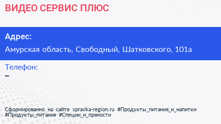 ВИДЕО СЕРВИС ПЛЮС по адресу Амурская область, Свободный, Шатковского, 101а в дальнейшем Организация, размещена в следующих категориях: