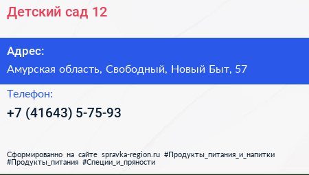 Детский сад №12 по адресу Амурская область, Свободный, Новый Быт, 57 в дальнейшем Организация, размещена в следующих категориях:
