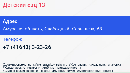 Детский сад №13 по адресу Амурская область, Свободный, Серышева, 68 в дальнейшем Организация, размещена в следующих категориях: