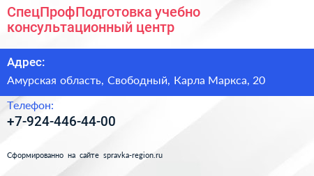 СпецПрофПодготовка, учебно-консультационный центр по адресу Амурская область, Свободный, Карла Маркса, 20 в дальнейшем Организация, размещена в следующих категориях: