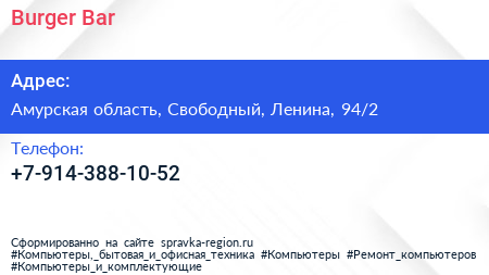 Burger Bar по адресу Амурская область, Свободный, Ленина, 94/2 в дальнейшем Организация, размещена в следующих категориях: