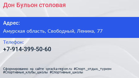 Дон Бульон, столовая по адресу Амурская область, Свободный, Ленина, 77 в дальнейшем Организация, размещена в следующих категориях: