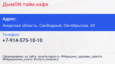 ДымON, тайм-кафе по адресу Амурская область, Свободный, Октябрьская, 69 в дальнейшем Организация, размещена в следующих категориях:
