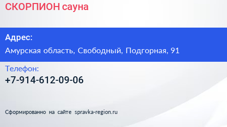 СКОРПИОН, сауна по адресу Амурская область, Свободный, Подгорная, 91 в дальнейшем Организация, размещена в следующих категориях: