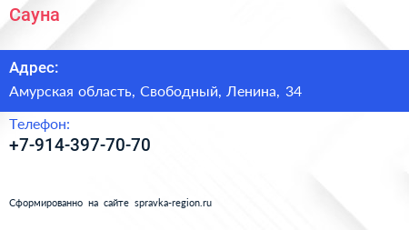 Сауна по адресу Амурская область, Свободный, Ленина, 34 в дальнейшем Организация, размещена в следующих категориях: