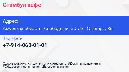 Стамбул, кафе по адресу Амурская область, Свободный, 50 лет Октября, 36 в дальнейшем Организация, размещена в следующих категориях: