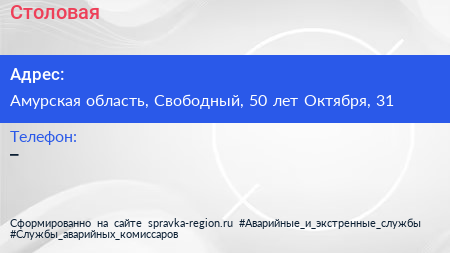 Столовая по адресу Амурская область, Свободный, 50 лет Октября, 31 в дальнейшем Организация, размещена в следующих категориях: