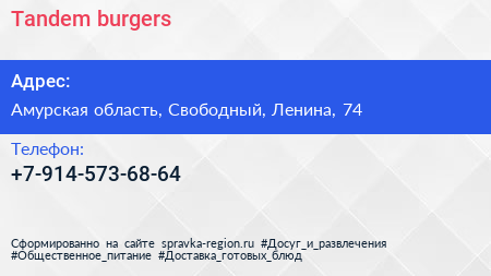 Tandem-burgers по адресу Амурская область, Свободный, Ленина, 74 в дальнейшем Организация, размещена в следующих категориях: