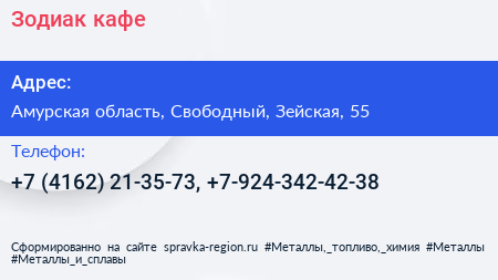 Зодиак, кафе по адресу Амурская область, Свободный, Зейская, 55 в дальнейшем Организация, размещена в следующих категориях:
