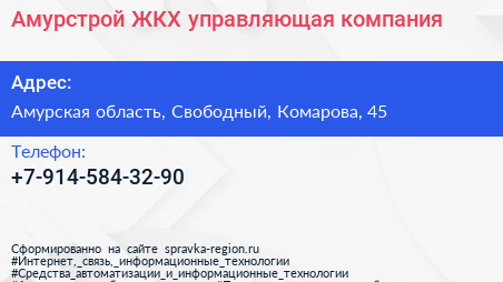 Амурстрой ЖКХ, управляющая компания по адресу Амурская область, Свободный, Комарова, 45 в дальнейшем Организация, размещена в следующих категориях: