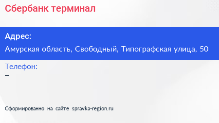 Сбербанк, терминал по адресу Амурская область, Свободный, Типографская улица, 50 в дальнейшем Организация, размещена в следующих категориях: