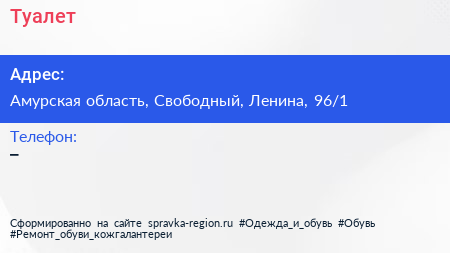 Туалет по адресу Амурская область, Свободный, Ленина, 96/1 в дальнейшем Организация, размещена в следующих категориях: