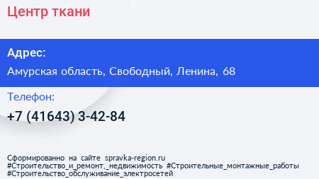 Центр ткани по адресу Амурская область, Свободный, Ленина, 68 в дальнейшем Организация, размещена в следующих категориях: