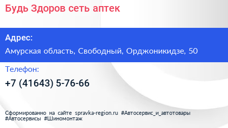 Будь Здоров, сеть аптек по адресу Амурская область, Свободный, Орджоникидзе, 50 в дальнейшем Организация, размещена в следующих категориях: