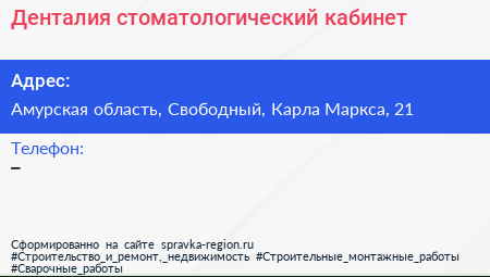 Денталия, стоматологический кабинет по адресу Амурская область, Свободный, Карла Маркса, 21 в дальнейшем Организация, размещена в следующих категориях: