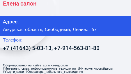 Елена, салон по адресу Амурская область, Свободный, Ленина, 67 в дальнейшем Организация, размещена в следующих категориях: