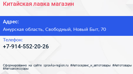 Китайская лавка, магазин по адресу Амурская область, Свободный, Новый Быт, 70 в дальнейшем Организация, размещена в следующих категориях: