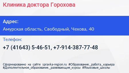 Клиника доктора Горохова по адресу Амурская область, Свободный, Чехова, 40 в дальнейшем Организация, размещена в следующих категориях: