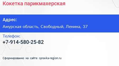 Кокетка, парикмахерская по адресу Амурская область, Свободный, Ленина, 37 в дальнейшем Организация, размещена в следующих категориях: