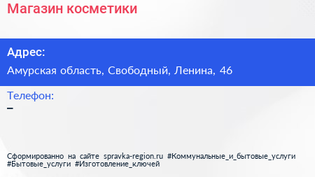 Магазин косметики по адресу Амурская область, Свободный, Ленина, 46 в дальнейшем Организация, размещена в следующих категориях: