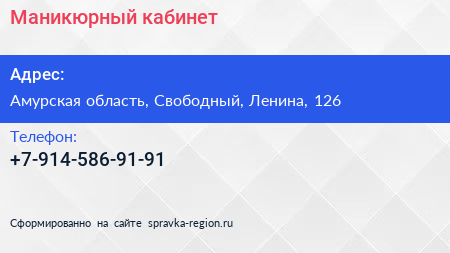 Маникюрный кабинет по адресу Амурская область, Свободный, Ленина, 126 в дальнейшем Организация, размещена в следующих категориях:
