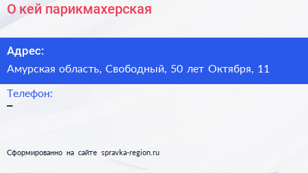 О`кей, парикмахерская по адресу Амурская область, Свободный, 50 лет Октября, 11 в дальнейшем Организация, размещена в следующих категориях: