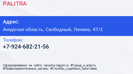 PALITRA по адресу Амурская область, Свободный, Ленина, 47/1 в дальнейшем Организация, размещена в следующих категориях: