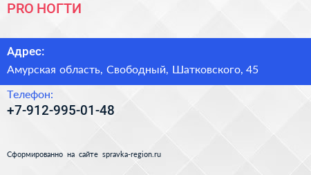 PRO НОГТИ по адресу Амурская область, Свободный, Шатковского, 45 в дальнейшем Организация, размещена в следующих категориях:
