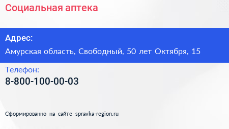 Социальная аптека по адресу Амурская область, Свободный, 50 лет Октября, 15 в дальнейшем Организация, размещена в следующих категориях: