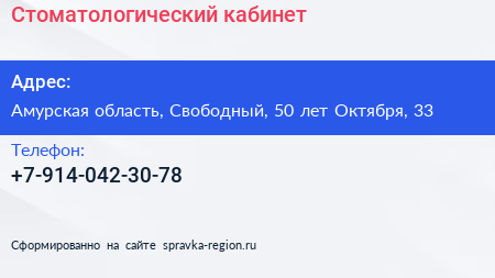 Стоматологический кабинет по адресу Амурская область, Свободный, 50 лет Октября, 33 в дальнейшем Организация, размещена в следующих категориях: