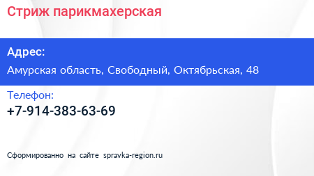 Стриж, парикмахерская по адресу Амурская область, Свободный, Октябрьская, 48 в дальнейшем Организация, размещена в следующих категориях: