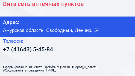 Вита, сеть аптечных пунктов по адресу Амурская область, Свободный, Ленина, 54 в дальнейшем Организация, размещена в следующих категориях: