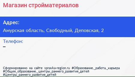 Магазин стройматериалов по адресу Амурская область, Свободный, Деповская, 2 в дальнейшем Организация, размещена в следующих категориях: